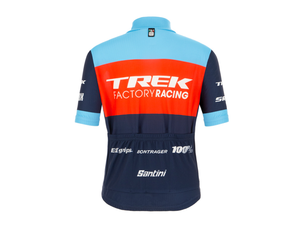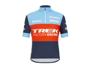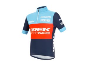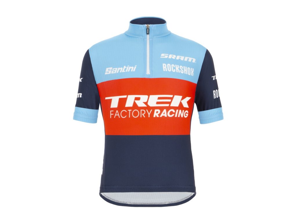 Prodyšný, lehký dětský dres s krátkými rukávy elastického střihu? To je model SANTINI Replica Kids Trek factory racing v designu závodní soupravy.