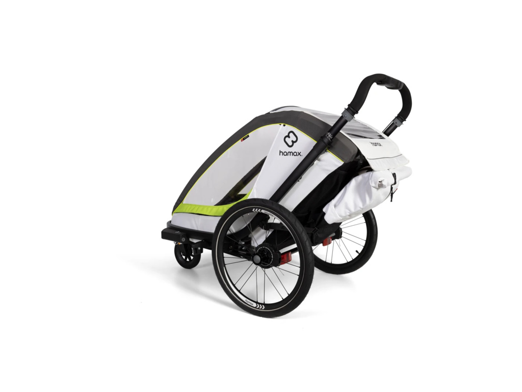 Jednomístný vozík Hamax Breeze ONE kombinuje sportovní design a chytré funkce. Lze jej snadno použít jako vozík za kolo, kočárek, kočárek na jogging a sáňky.