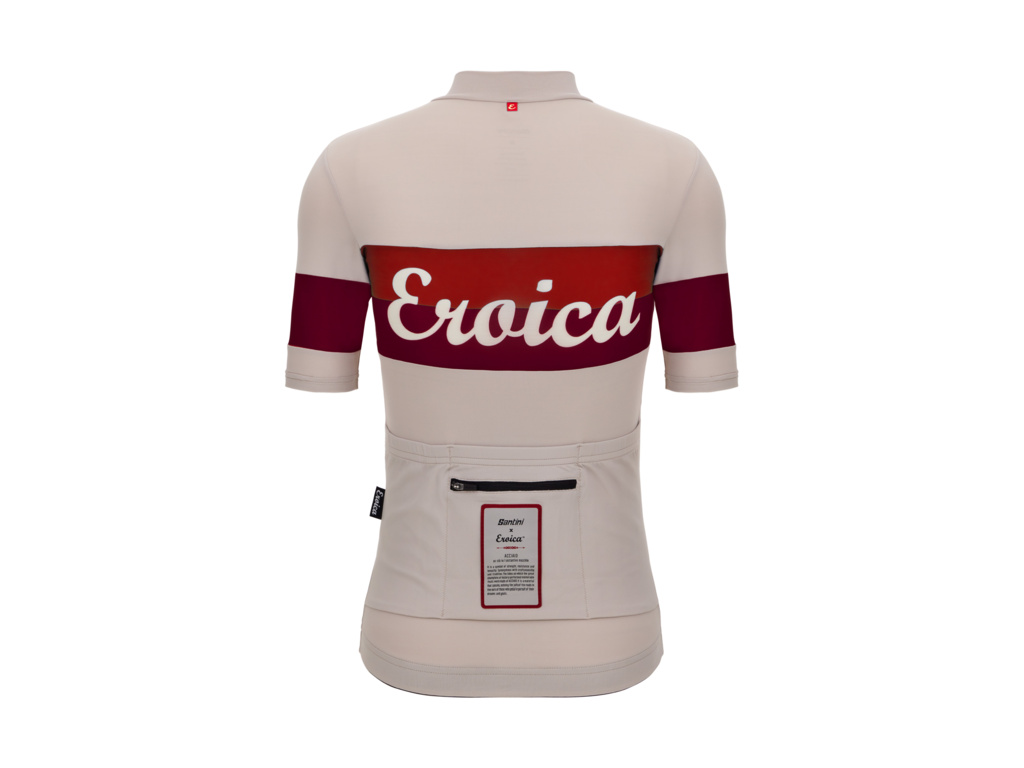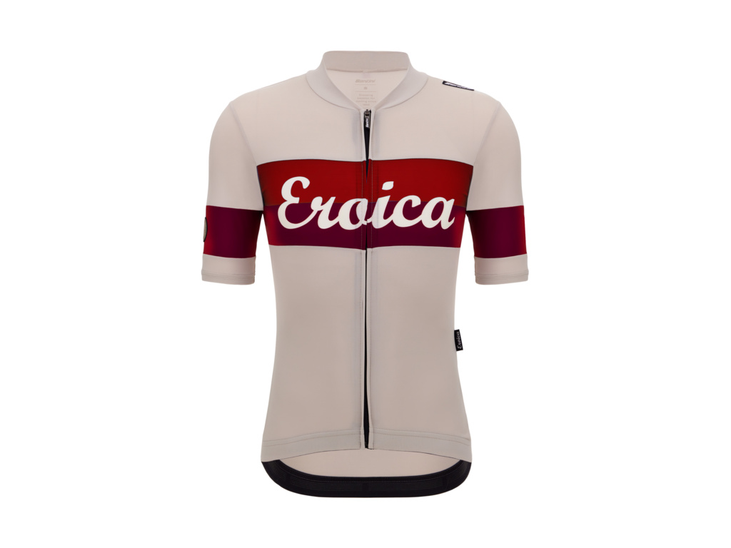 Dres SANTINI Eroica Quiete není jen kusem oblečení, ale oslavou kouzla historické cyklistiky. Design v rafinované azurové barvě s klasickým bílo-modrým středovým pruhem a logem Eroica na hrudi i zádech odkazuje na zlatou éru tohoto sportu. Dres je vyroben z materiálu, který vyniká skvělou prodyšností a přizpůsobí se konturám těla, aniž by působil nepříjemnou kompresi. Díky elastickému spodnímu lemu se silikonovým gripem dres perfektně drží na místě i při delších vyjížďkách. Celkový čistý vzhled doplňuje krytý zip a speciální „emoční“ etiketa na zádech, která připomíná autentického ducha závodů Eroica.