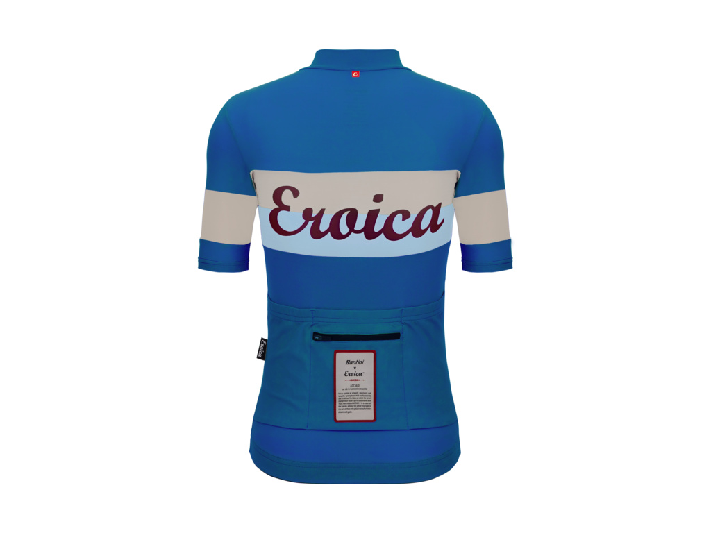 Dres SANTINI Eroica Quiete není jen kusem oblečení, ale oslavou kouzla historické cyklistiky. Design v rafinované azurové barvě s klasickým bílo-modrým středovým pruhem a logem Eroica na hrudi i zádech odkazuje na zlatou éru tohoto sportu. Dres je vyroben z materiálu, který vyniká skvělou prodyšností a přizpůsobí se konturám těla, aniž by působil nepříjemnou kompresi. Díky elastickému spodnímu lemu se silikonovým gripem dres perfektně drží na místě i při delších vyjížďkách. Celkový čistý vzhled doplňuje krytý zip a speciální „emoční“ etiketa na zádech, která připomíná autentického ducha závodů Eroica.