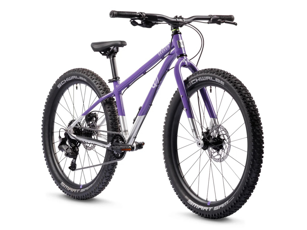 Kola s utěsněnými ložisky a pevnými osami zajišťují maximální tuhost a odolnost výpletů. Široké pláště Schwalbe Smart Sam 2.35" poskytují vynikající trakci a tlumení, což dává jezdci sebevědomí na kořenech i v blátě. Seeker 24 je tak ideálním parťákem pro ambiciózní bikery, kteří chtějí objevovat nové traily bez limitů.