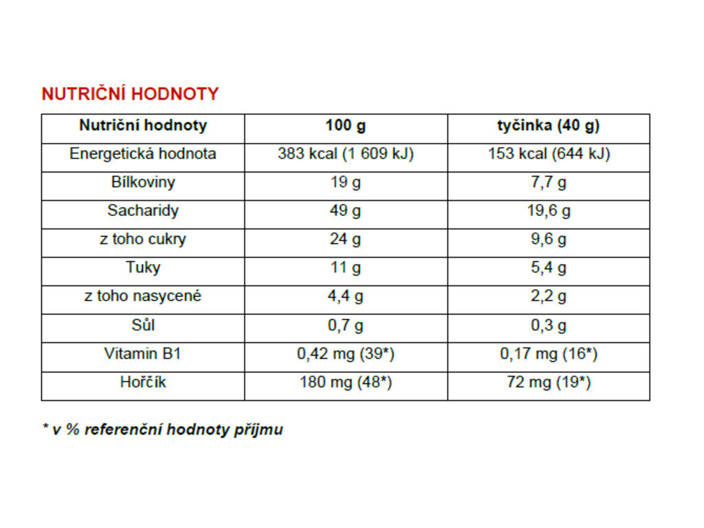 Cereální bezlepková tyčinka vhodná ke konzumaci kdykoliv během dne. Je zdrojem energie, bílkovin, hořčíku a vitaminu B1.