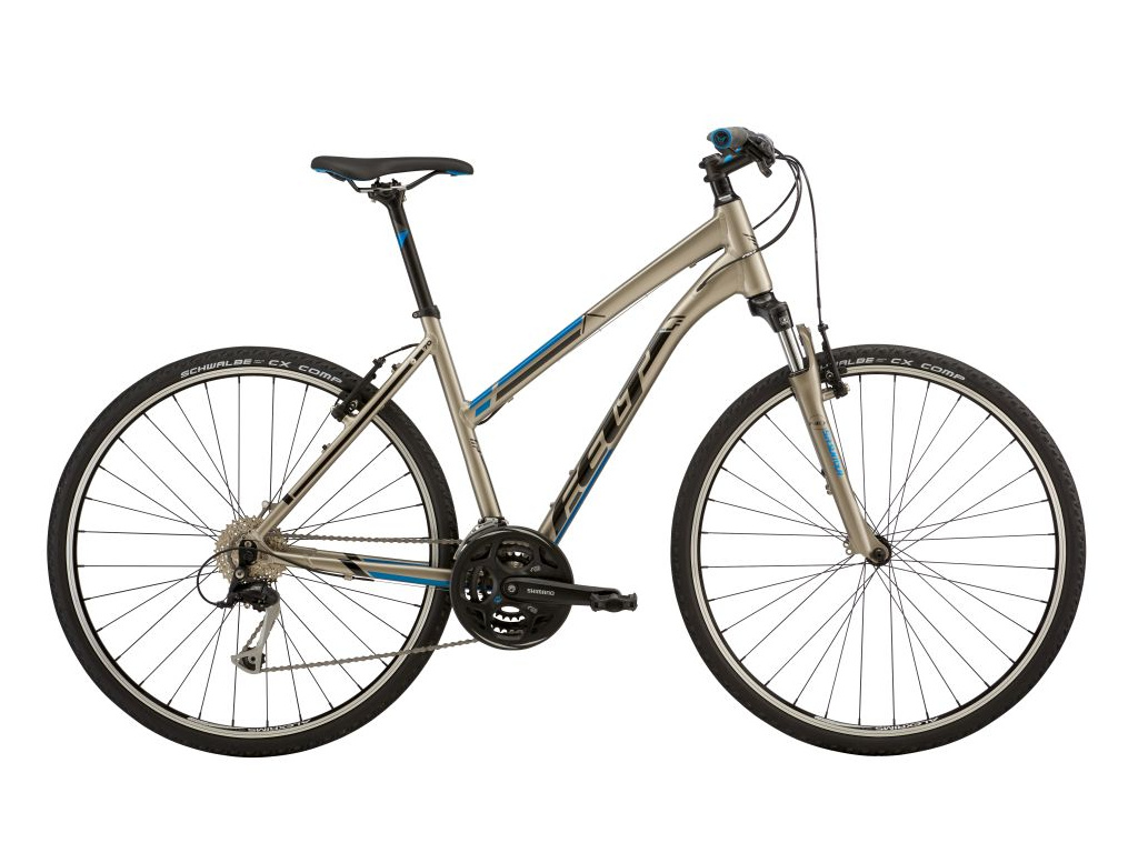 Dámské crossové kolo FELT QX70 je díky lehkému hliníkovému rámu, odpružené vidlici Suntour, kvalitním komponentům Shimano s 24 převody a ráfkovým brzdám Tektro ideálním kolem pro rekreační jezdce.