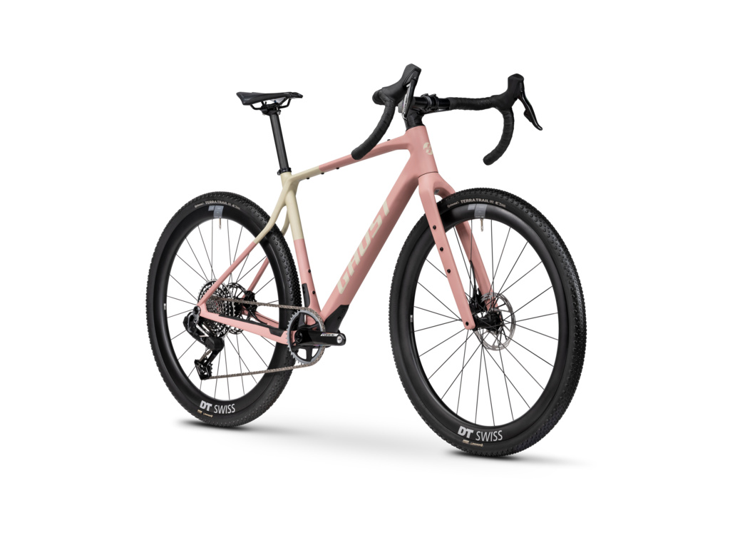 ● Asket CF X: Růžový rám pohání 13rychlostní elektrická sada SRAM XPLR AXS a karbonovými koly DT Swiss GRC 1600 SP.