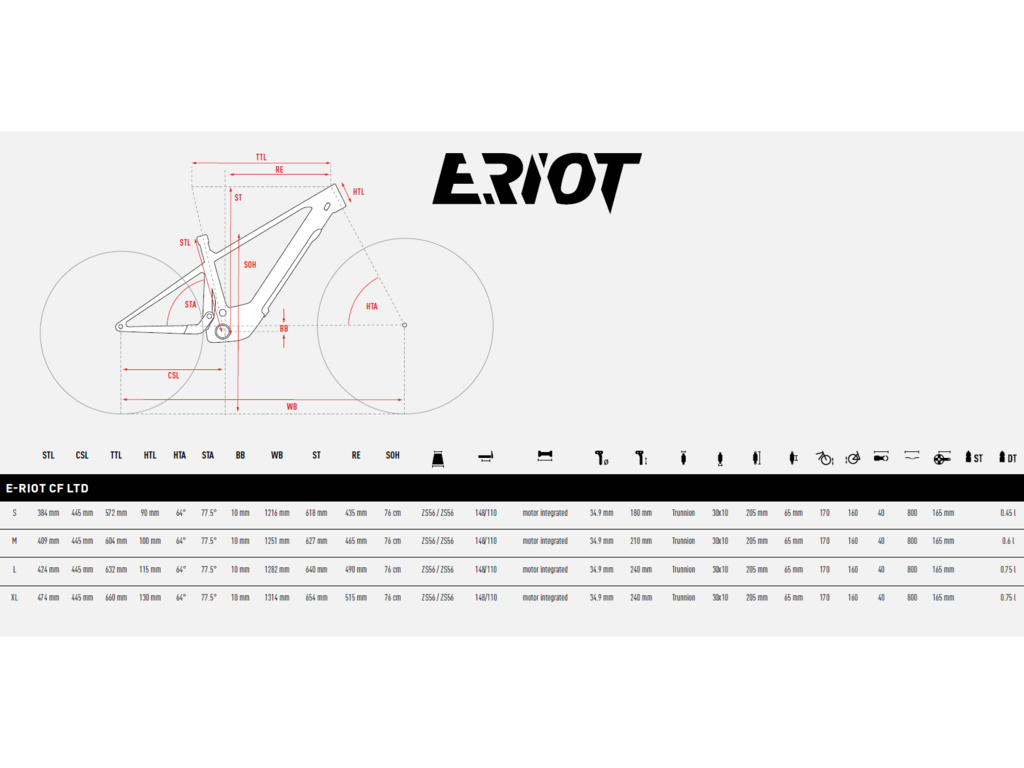 ● E-RIOT LTD: exkluzivní a limitovaná verze poháněná tím nejlepším od Bosche – Motor CX-R s lehkým, magnéziovým tělem. Kombinuje decentní zlato-hnědý lak se zlatou úpravou KASHIMA coating™ tlumičů FOX. Prvotřídní komponenty Shimano XTR Di2 wireless, doplňují 4pístkové brzdy XTR, DT Swiss karbonové ráfky a karbonové řídítka Raceface.