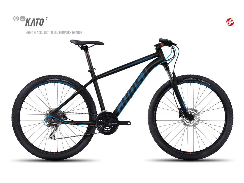 Horské kolo Ghost Kato 2 je vhodné pro rekreační i každodenní ježdění. Lehký a zároveň odolný hliníkový rám je osazen vidlicí RST Blaze s uzamykáním z řídítek a komponenty Shimano s 3x8 převody, včetně hydraulických brzd Shimano. 27,5 palcová kola, obzvlášť vhodná pro jezdce s menší výškou postavy, jsou obuta do oblíbených plášťů Michelin s jemným vzorkem.