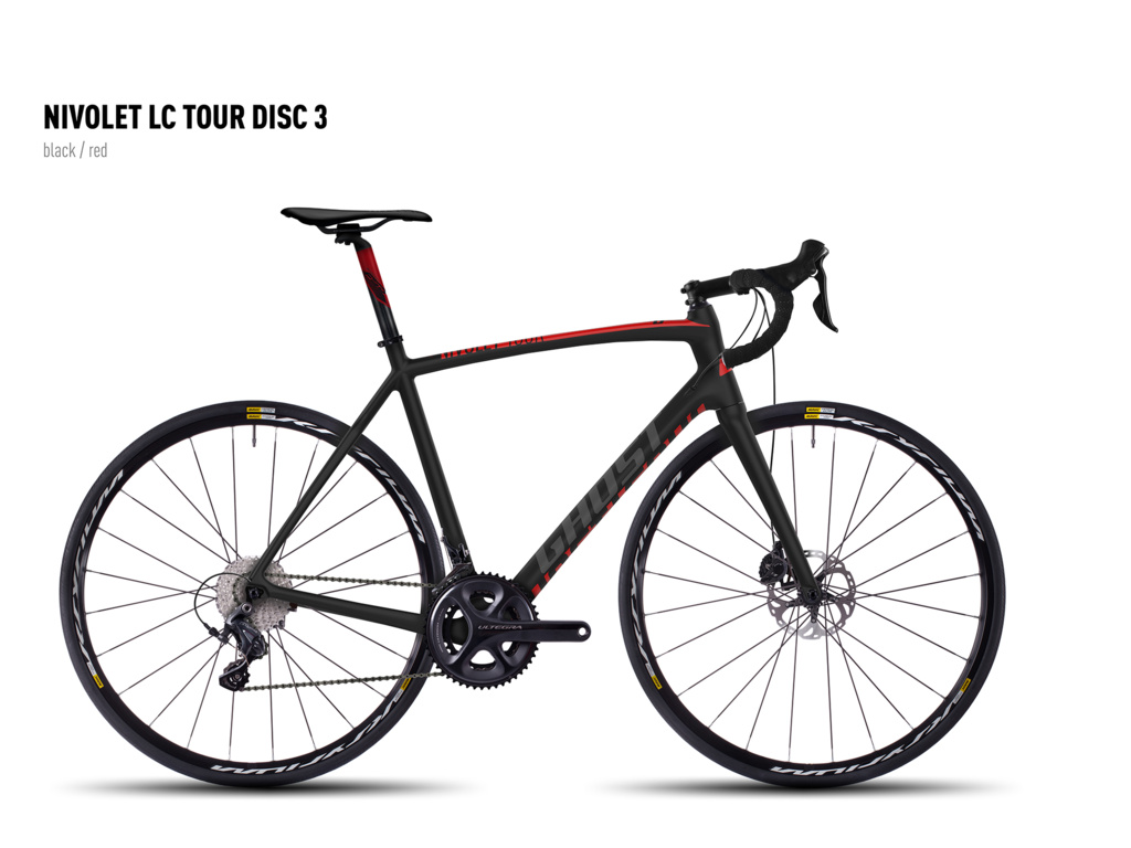 Ghost Nivolet Tour LC Disc 3 je silniční kolo pro vytrvalostní jezdce i hobby závodníky. Lehký, tuhý a zároveň komfortní karbonový rám je osazen sadou Shimano Ultegra 2x11 s Compact převodníky. Vysoký brzdný účinek za všech podmínek zajišťují hydraulické kotoučové brzdy Shimano BR-RS805. Zapletená kola jsou použita Mavic Ksyrium Disc s plášti Yksion Pro.