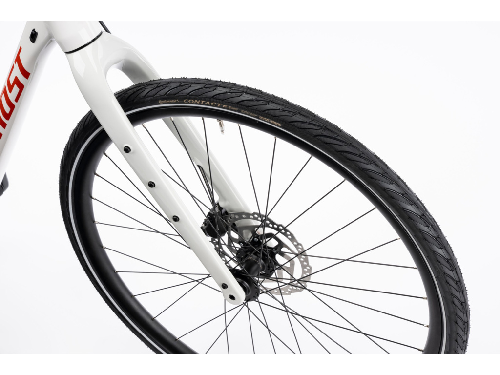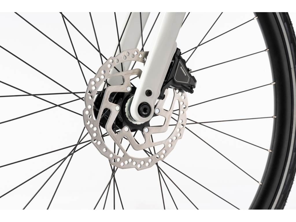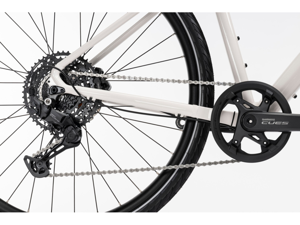 Pohon tvoří sada Shimano CUES U4000 1×10 s technologií LINKGLIDE, která byla vyvinuta speciálně pro dlouhou životnost a hladké řazení i pod zátěží. Komponenty CUES jsou robustní, přesné a nenáročné na údržbu, což z nich dělá ideální a ekonomickou volbu pro každodenní použití — ať už při dojíždění, tréninku nebo rekreační jízdě. Spolehlivé hydraulické kotoučové brzdy Shimano zaručují jistý výkon za všech podmínek a jsou doplněny osvědčenými plášti Continental Contact s reflexními prvky.