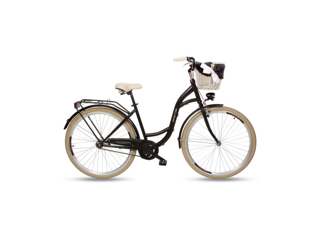 Elegantní městské kolo v retro designu, vhodné pro ježdění po městě i na venkově. Tuhý ocelový rám je díky snížené konstrukci uzpůsobený pro pohodlné nastoupení a vhodný pro výšku postavy cca od 160 do 180 cm. Součástí je přední proutěný košík s designovou výstelkou, kvalitní LED osvětlení, blatníky, zadní nosič, stojan a bezpečnostní kryt řetězu.