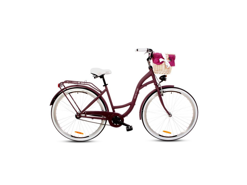 Elegantní městské kolo v retro designu, vhodné pro ježdění po městě i na venkově. Tuhý ocelový rám je díky snížené konstrukci uzpůsobený pro pohodlné nastoupení a vhodný pro výšku postavy cca od 160 do 180 cm. Součástí je přední proutěný košík s designovou výstelkou, kvalitní LED osvětlení, blatníky, zadní nosič, stojan a bezpečnostní kryt řetězu.