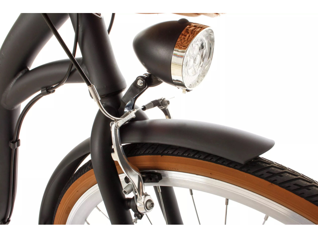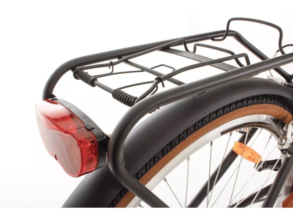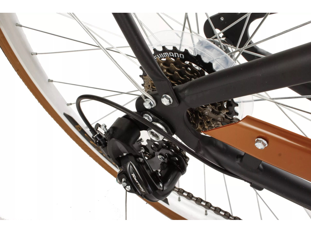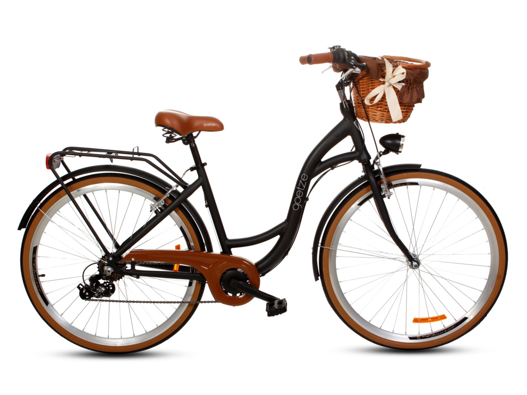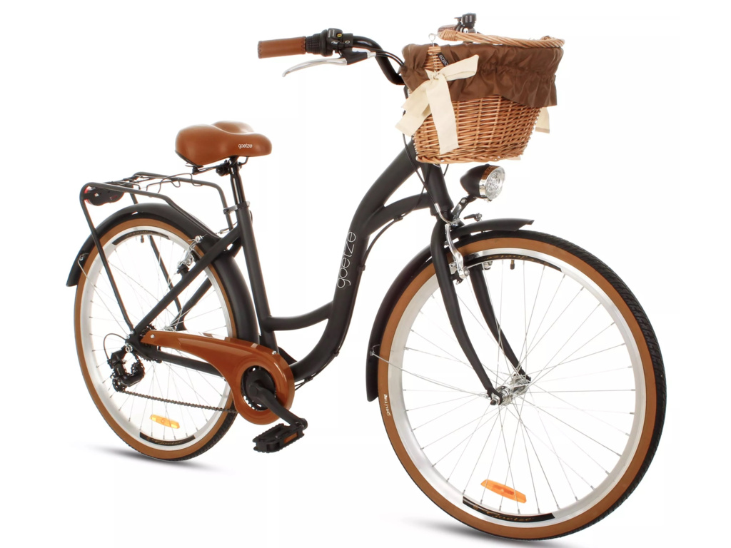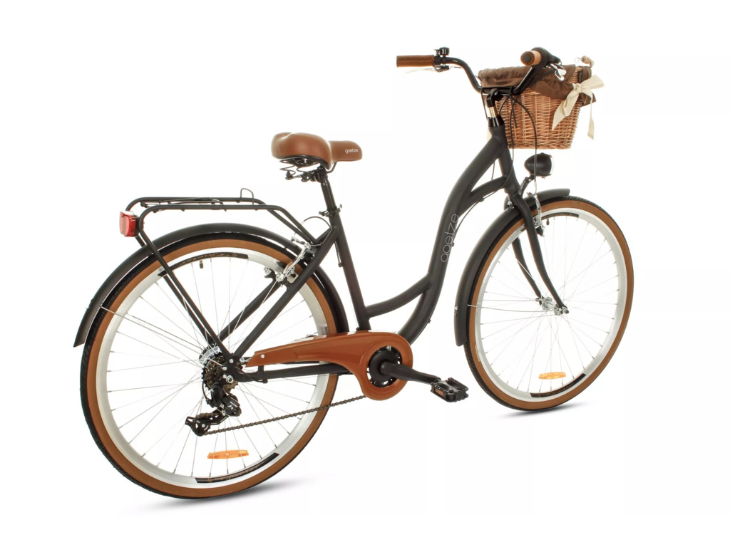 Spolehnout se můžete na kvalitní řazení Shimano Tourney s otočným řazením a 7 převody a ráfkové V-brzdy na předním i zadním kole. Součástí je proutěný přední košík s designovou výstelkou, kvalitní LED osvětlení, blatníky, zadní nosič, stojan a bezpečnostní kryt řetězu.