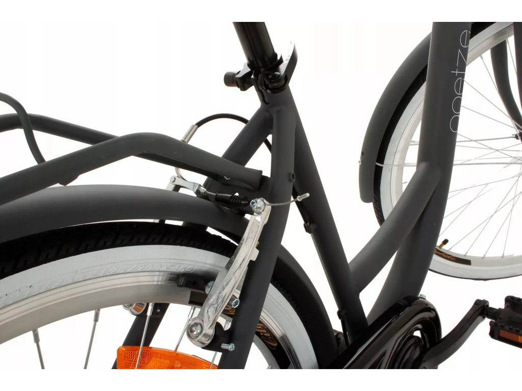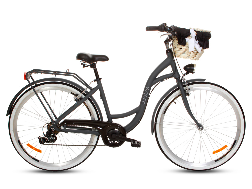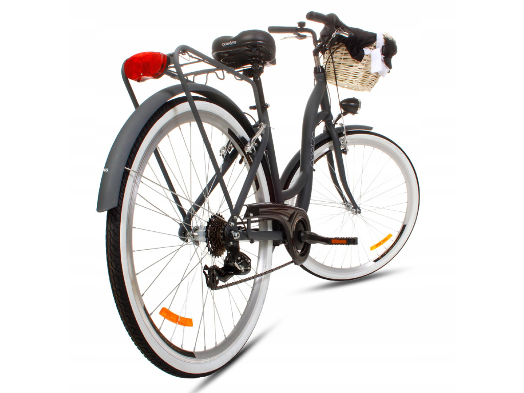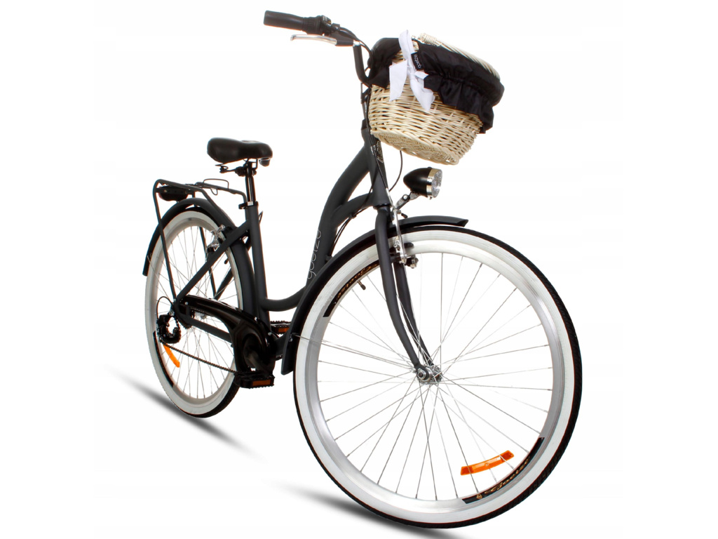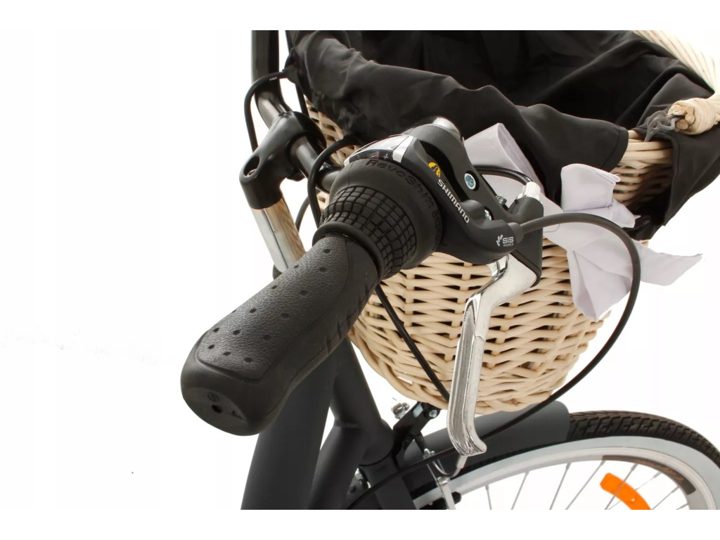 Spolehnout se můžete na kvalitní řazení Shimano Tourney s otočným řazením a 7 převody a ráfkové V-brzdy na předním i zadním kole. Součástí je proutěný přední košík s designovou výstelkou, kvalitní LED osvětlení, blatníky, zadní nosič, stojan a bezpečnostní kryt řetězu.