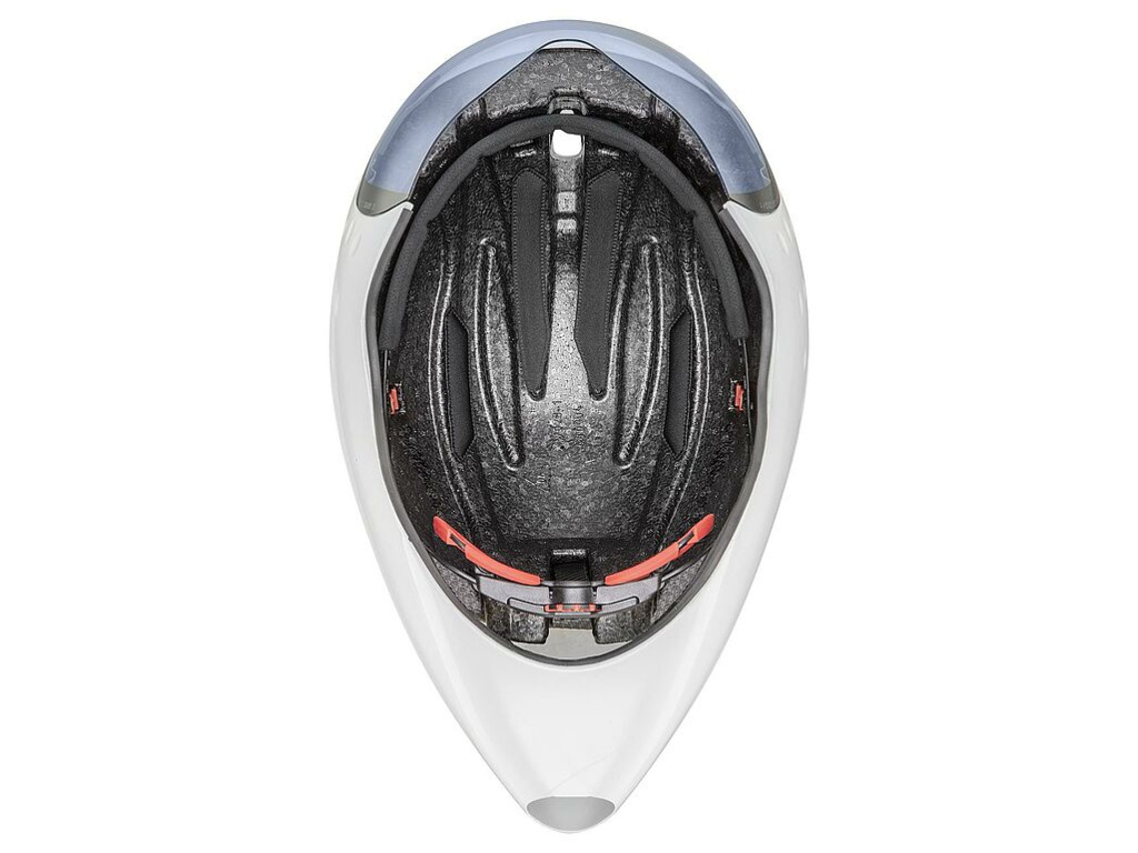 Helma UVEX Race 8 White-Black je postavená pro časovku a triatlon, kde rozhodují sekundy a každá úspora wattů se počítá. Zkrácený „kapkový“ tvar pomáhá vést proudění vzduchu čistě přes zadní část hlavy a ramena s minimem turbulencí. Boky helmy mají speciálně uspořádané důlky inspirované golfovým míčkem, které pomáhají snižovat odpor vzduchu a stabilizovat proudění při vyšších rychlostech.
