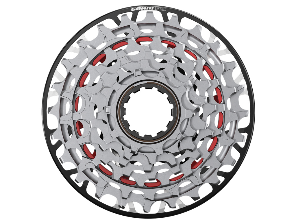Sjezdová 7rychlostní kazeta pro systém SRAM Transmission, navržená pro malé odstupy mezi pastorky a maximální efektivitu přenosu síly v závodním DH nasazení.