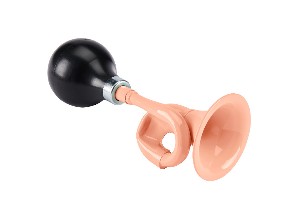 Klasický ocelový klakson s velkým gumovým balonkem a lesklým lakovaným povrchem