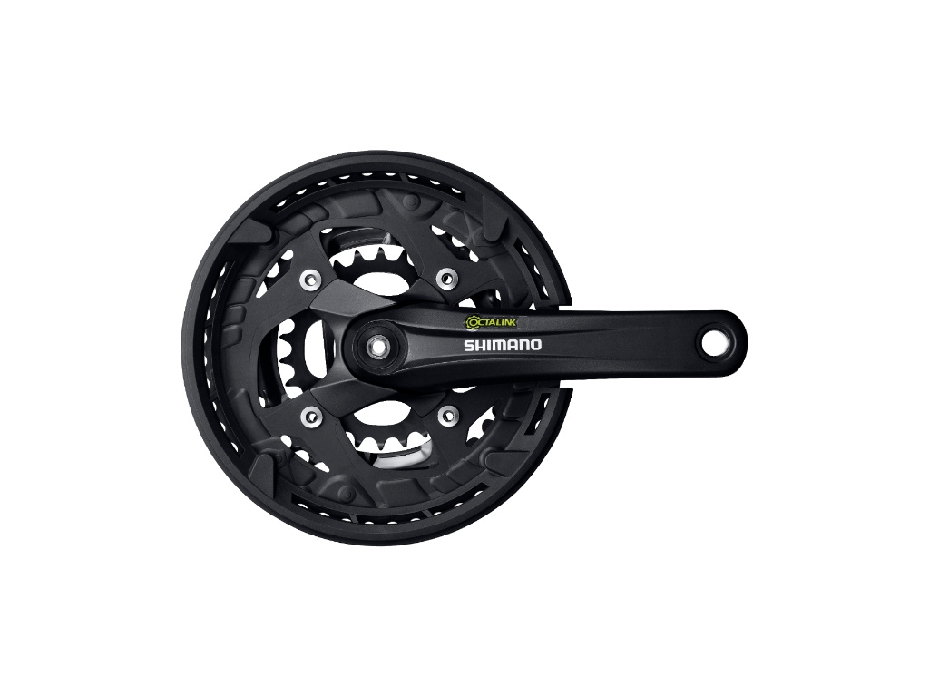 Hliníkové trekingové kliky SHIMANO FC-T4010 v černém provedení s krytem pro 9rychlostní kazetu s počtem zubů 48-36-26 v délce 170 / 175 mm.