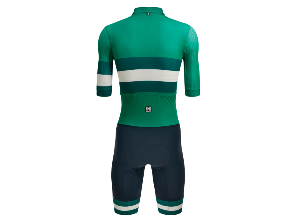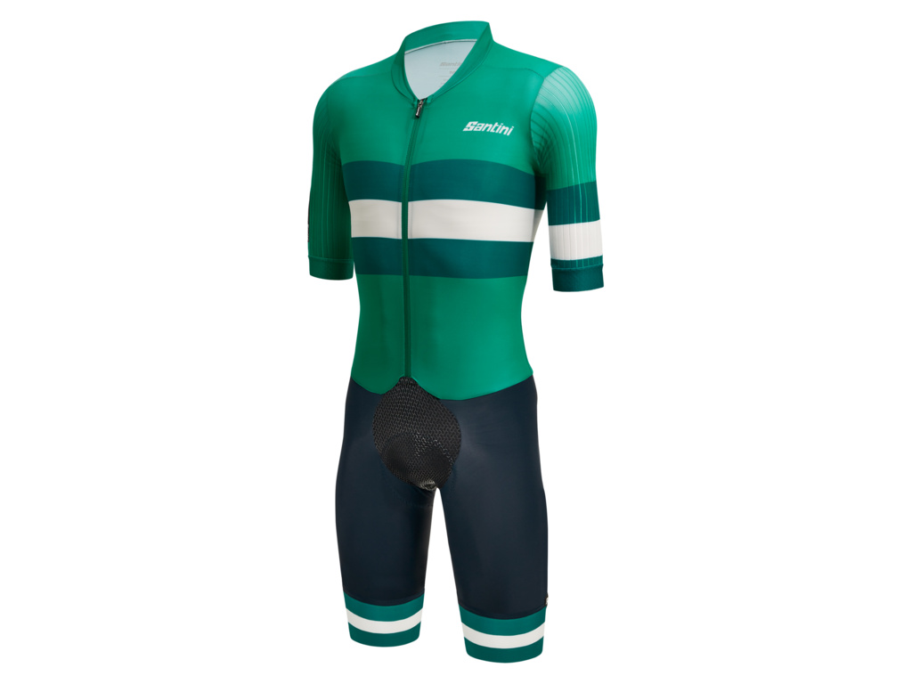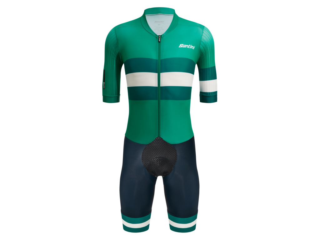 Kombinéza SANTINI Viper Bengal je vyrobena z italských lehkých tkanin, které poskytují svěží pocit na těle. Rukávy jsou navrženy z aerodynamické, vysokorychlostní tkaniny s elastickou konstrukcí vertikálních pruhů pro co největší aerodynamickou účinnost. Spodní část je vyrobena z kompaktní italské tkaniny s technologií Power Compression, která poskytuje střední kompresi bez omezování pohybu. Kombinéza má střih "druhé kůže" s delšími rukávy a nohavicemi se surově střiženou přilnavou tkaninou na manžetách a stehnech pro větší aerodynamiku. Navíc je vybavena úchytem v oblasti rozkroku pro stabilní polohu na sedle. Vložka C3 s gelovou strukturou a ergonomickým 3D povrchem je ideální pro dlouhé vzdálenosti a náročné závody.