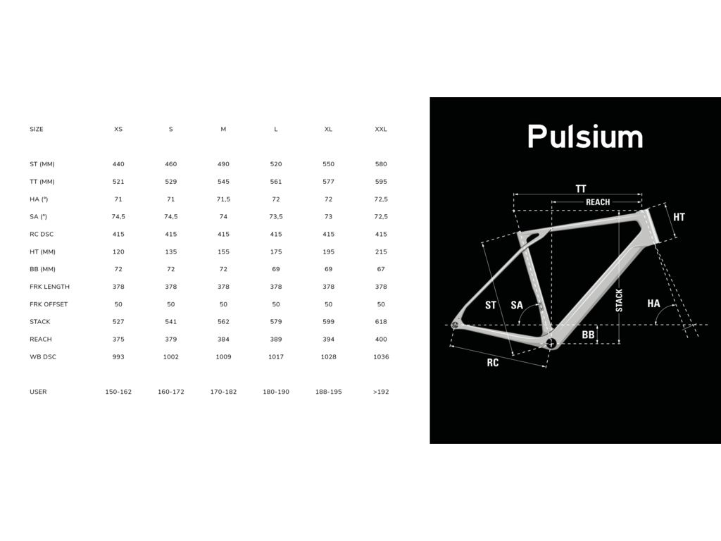 Dojíždění na kole, bikepacking, závody na ultra-vzdálenosti nebo cross-trénink špičkových sportovců, kteří chtějí udržet trénink pestrý a zajímavý! - Pro jeho geometrii a všestranné schopnosti není nic nemožné – umožňuje jízdu kdekoli (štěrk, dlážděné silnice nebo dobře udržované stezky). Pulsium nabízí jemnost a charakter zaměřený na vzdálenosti: vše v jeho DNA směřuje k touze po dálce, počínaje jeho několika úchyty pro nosiče a blatníky až po prostor na 38mm pláště.