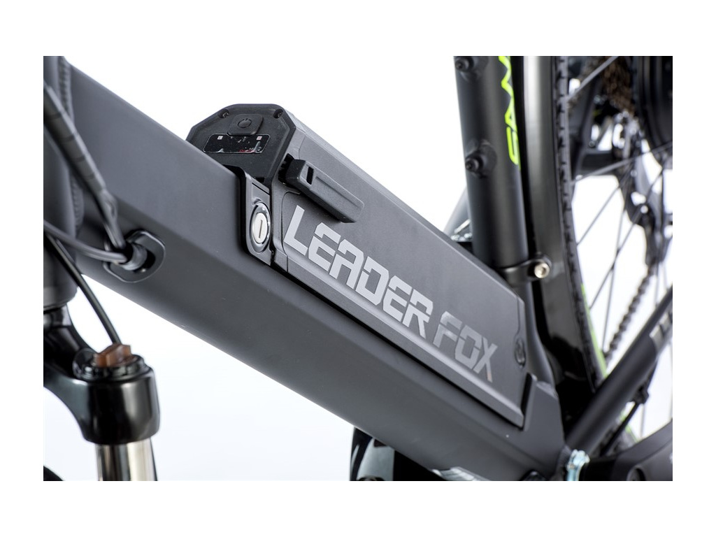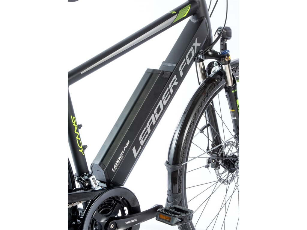 Nový Leader Fox Sandy je vybaven integrovanou rámovou baterií s výkonnými články LG s kapacitou 16Ah (576Wh) a výstupem pro USB (lze využít pro nabíjení telefonu, navigace apod.). Dalším plusem je rychlo nabíječka s nabíjecím proudem 3A. Díky níž se výrazně zkrátí doba nabíjení baterie. Dojezd na plně nabitou baterii se pohybuje okolo 80 km, maximální dojezd j