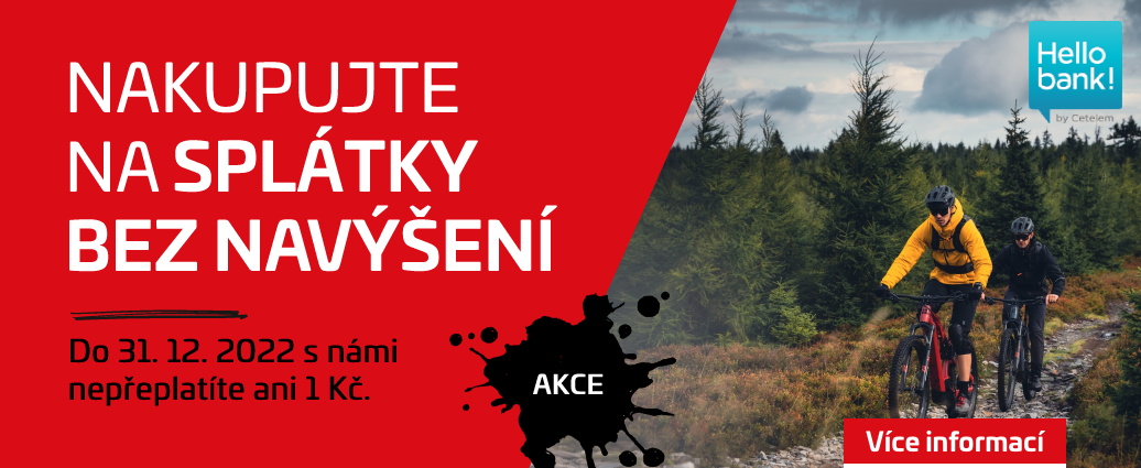 Pořiďte si nové kolo, elektrokolo nebo cyklistickou výbavu. Akční nabídka "Bez navýšení 0 % + 10 x 10 %" od Hello bank! je platná do 31. 12. 2022. Platbu vám rozložíme na 10 měsíců a za zboží nepřeplatíte ani korunu. Akční nabídku lze využít jen do 31. 12. 2022. Více o nákupech na splátky s Hello bank! se dozvíte zde.