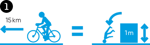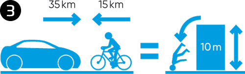 Hlavu máme jen jednu a neúprosné zákony fyziky fungují i na kole. Pád z kola na hlavu v rychlosti 15 km/h odpovídá skoku po hlavě na beton z výšky jednoho metru (obr. 1). Při 25 km/h se už pád na hlavu rovná šipce na beton z 2,5m výšky (obr. 2). Při kolizi s autem je to ještě dramatičtější. Když jede kolo 15 km/h a auto 35 km/h, rovná se síla nárazu rychlosti 50 km/h a je srovnatelná se skokem po hlavě na beton z 10 m (obr. 3). Nechceme tvrdit, že vás přilba v takových situacích zachrání, každopádně ale dokáže následky nárazů zmírnit. Proto cyklistickou helmu nasazujeme vždy a všude.