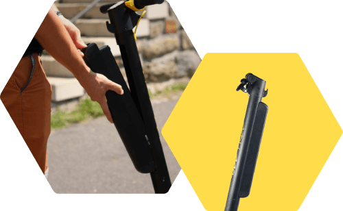 Baterie má dvojitou ochranu proti přebití, zkratu a přehřátí a lze ji snadno vyjmout, abyste při nabíjení nemuseli k zásuvce s celou koloběžkou. Praktické je i umístění akumulátoru na stojné tyči řídítek. Nejen při demontáži, ale i během jízdy. Oproti koloběžkám s baterií v podvozku totiž na Bee Free nehrozí, že při přejíždění nerovností nebo sjíždění z obrubníku poškodíte akumulátor. Lithiovou baterii s kapacitou 10 Ah a dojezdem až 45 km nabijete z úplného vybití do plna za 5-7 hodin.