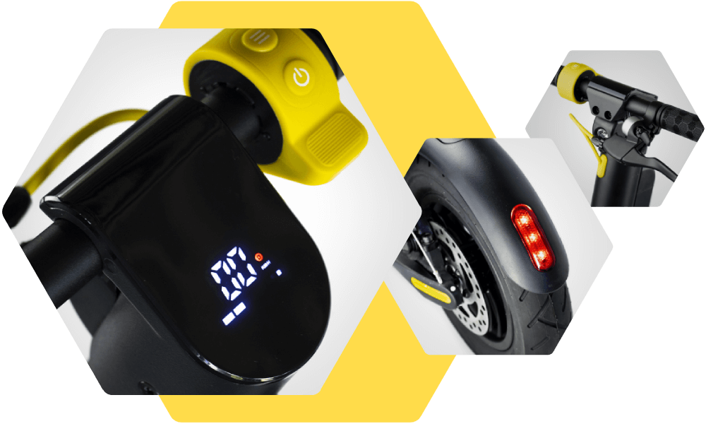Bee Free Scooter 1 má přední LED světlo, zadní červenou svítilnu a odrazky po stranách, abyste viděli a byli vidět i v noci. O bezpečné a rychlé zastavení se stará trojitý brzdný systém. Zmáčknutím brzdové páčky aktivujete jak zadní kotoučovou brzdu, tak elektronickou brzdu v motoru. Dodatečnou brzdnou sílu získáte sešlápnutím zadního blatníku.
