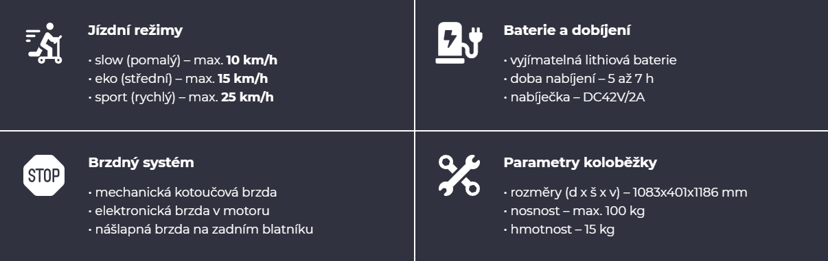 Rozměry koloběžky (délka, šířka, výška): 1083x401x1186 mm