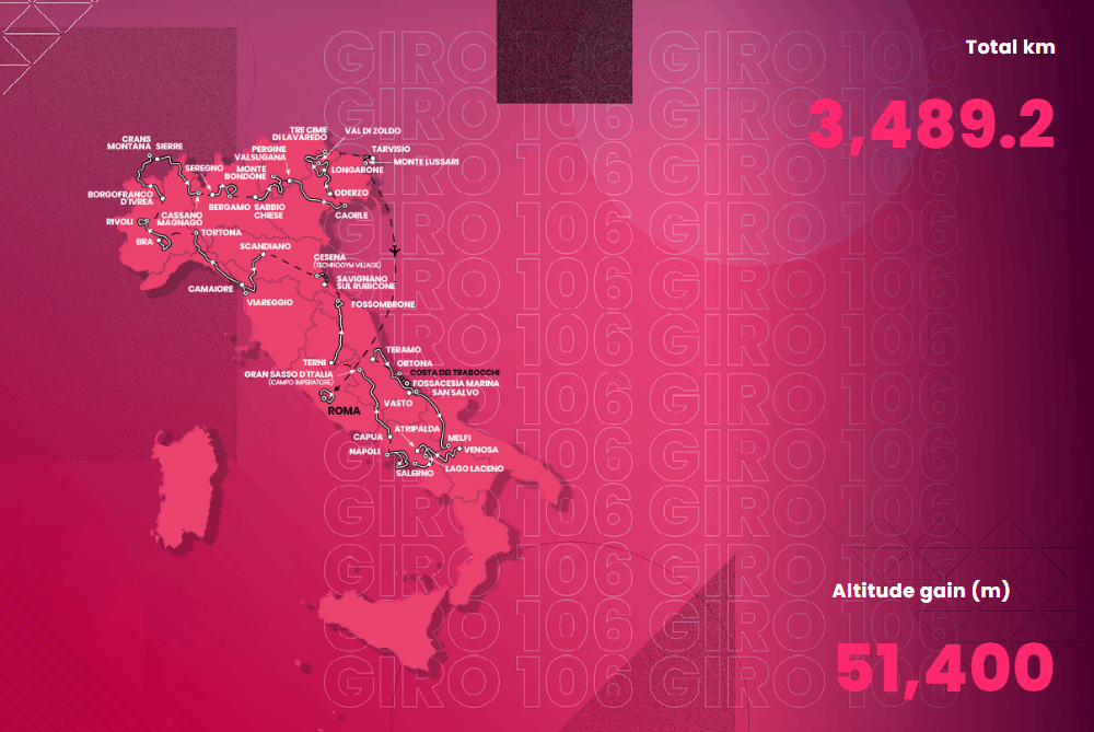Na programu závodu je již tradičních 21 etap z toho 3 časovky, 8 rovinatých etap, 5 kopcovitých a 5 vyloženě horských. Celkem závodníci urazí 3 489,2 km s průměrem 166,2 km na etapu a nastoupají 51 400 výškových metrů. Nejdelší etapu si peloton střihne 17. května. Povede z Camaiore do Tortony a měřit bude 219 km. Nejnáročnější bude zřejmě 19. etapa. Na trase z Longarone do Tre Cime di Lavaredo budou muset jezdci zdolat převýšení 5 400 m.