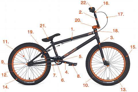 Komplet Freestyle BMX kolo je složeno ze specifických BMX komponentů. Tyto komponenty ovlivňují kvalitu a použití FBMX kola. Pro nejsnazší práci s tímto návodem doporučujeme nejprve najít hledaný komponent na obrázku. Komponent je označen číslem. Číslo naleznete dole v seznamu. Ten Vás odkáže na danou stránku, kde naleznete kompletní popis a specifikace.