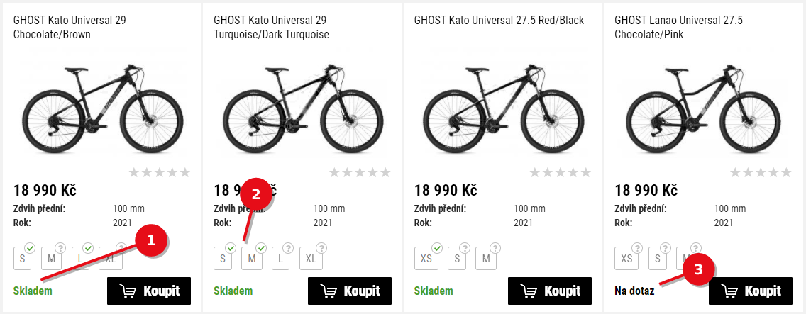 Abyste měli jistotu, že k vám objednané kolo dorazí během pár dnů a nebudete muset čekat, než ho výrobce vyrobí a dopraví do Česka, vybírejte jízdní kola a elektrokola, u kterých svítí zelený údaj „Skladem“ (Viz č. 1 na obrázku níže). Tato kola máme fyzicky v našem skladu a můžeme je okamžitě expedovat. Pozornost věnujte i údaji o velikosti. K dispozici jsou pouze rozměry, u kterých svítí zelená fajfka (Viz č. 2 na obrázku níže).