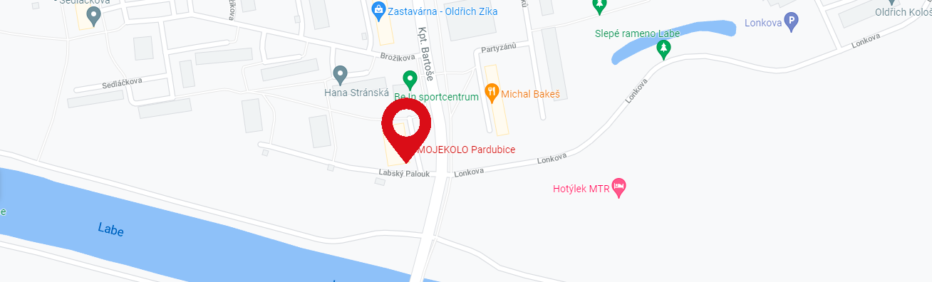 Pardubickou prodejnu Mojekolo najdete na adrese Labský Palouk 495 a její velkou výhodou je parkování přímo před vchodem. A pokud k nám míříte městskou hromadnou dopravou, svezou vás tu trolejbusy číslo 2 a 13. Vystupovat budete na zastávce Polabiny, Lidická.
