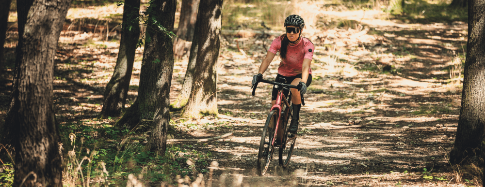 "Když se začly traily po Čechách objevovat, tak mě jeden kámoš právě vytáhnul a mě to hrozně nadchlo," vysvětluje Eva, proč má kromě gravelu doma už pár let i celopéro. Začínala na modelu GHOST Slamr 9.9 LC, který jsme spolu vydražili v dobročinné aukci, pak jezdila na trailovém monstru GHOST Riot Trail Full Party 29 a aktuálně sedlá GHOST Lector FS Universal.