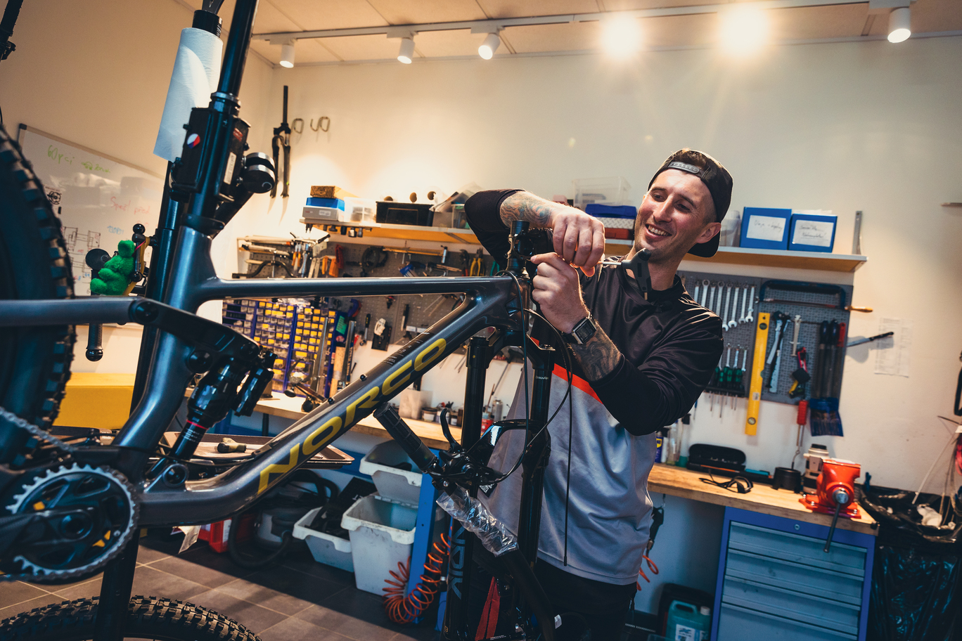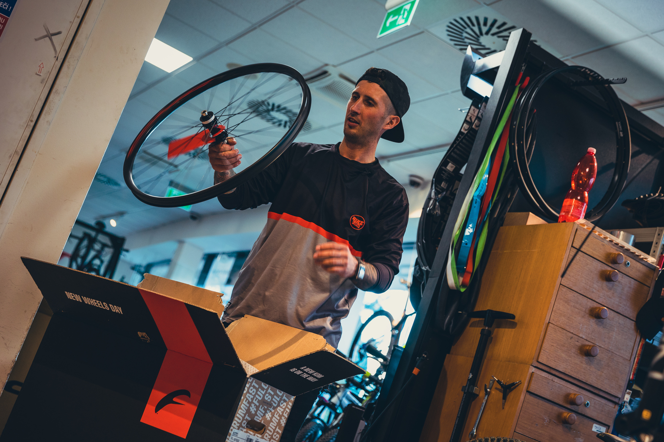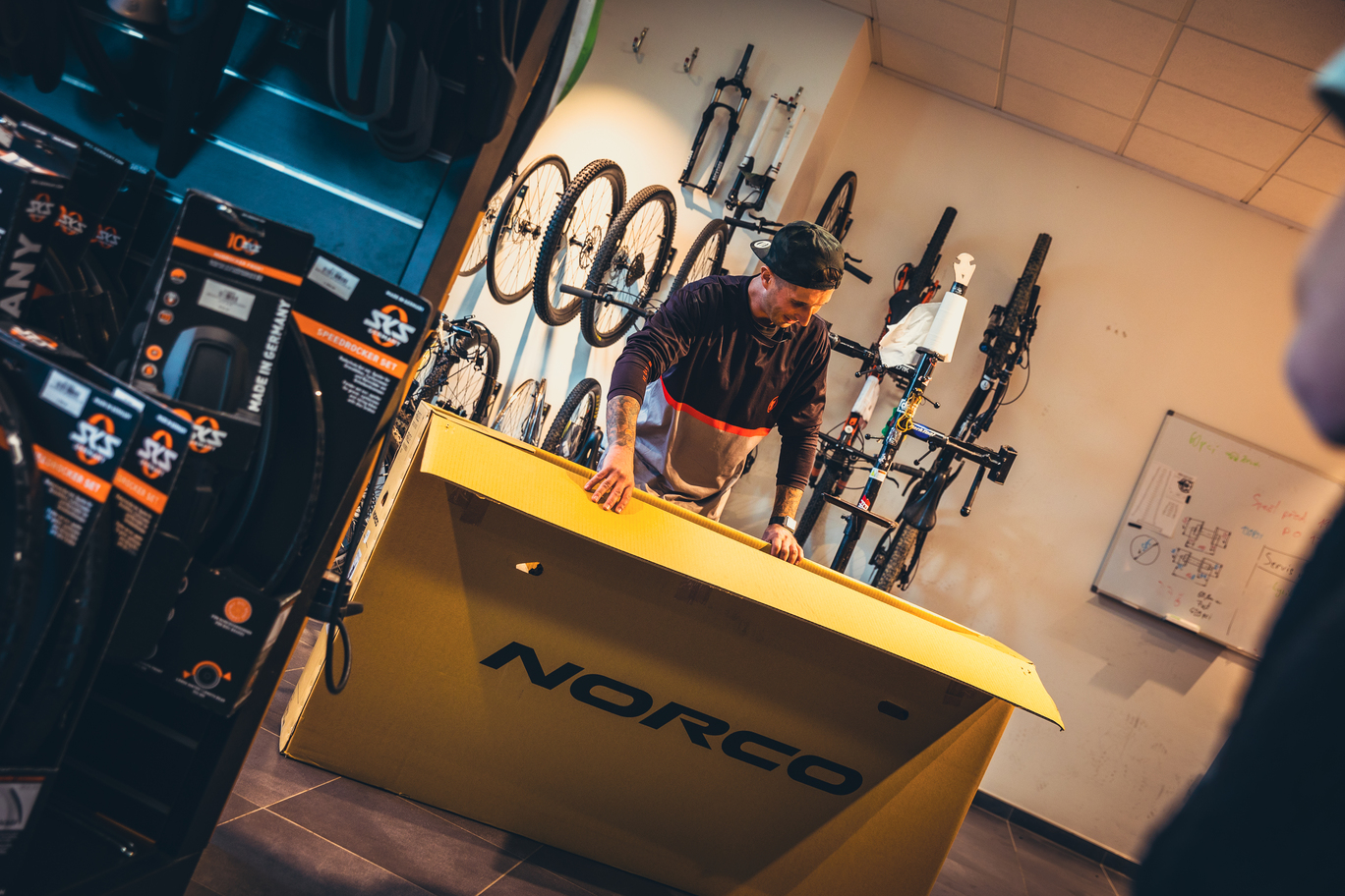Damjan chtěl na kolo ihned nahodit pár svých odzkoušených komponentů, takže si Norco nechal doručit k nám do bohunické pobočky v Brně. Byli jsme tak u toho, když ho vytáhl z krabice a s kluky z Mojekolo prodejny ho okamžitě okořenil několika top díly.