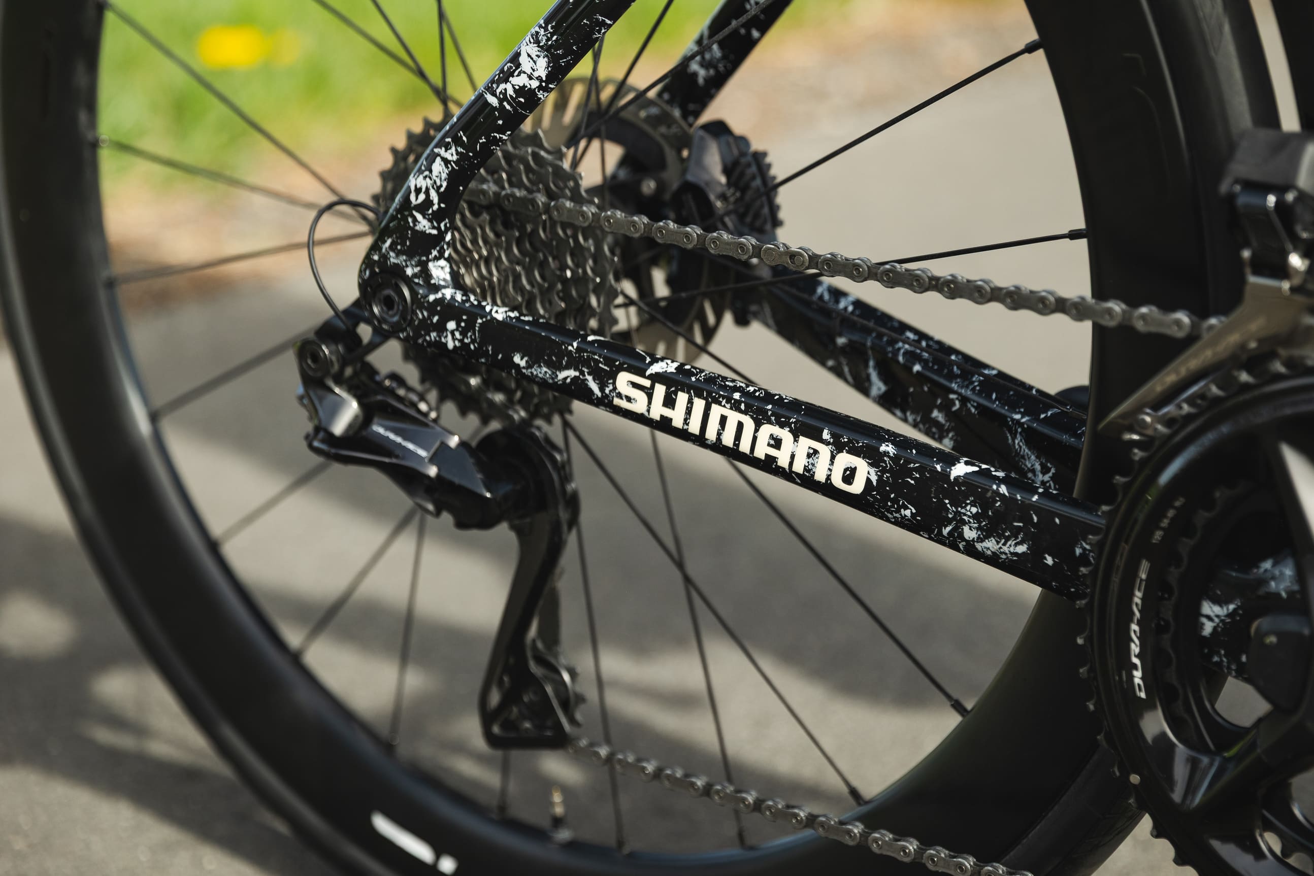 "Vozím velikost 56, takže 'eLko'. Jsme sponzorovaný Shimanem, takže máme Shimano páky 'Durový' (Dura-Ace, pozn. red.) na závod. Normálně máme závodní i 'Durový' kliky s waťákem, ale na trénink mám teďka jenom Ultegru," pokračuje. Délka klik 172,5 mm. Kola vozí karbonová s výškou ráfku 50 mm s pláštěma tubeless na trénink.