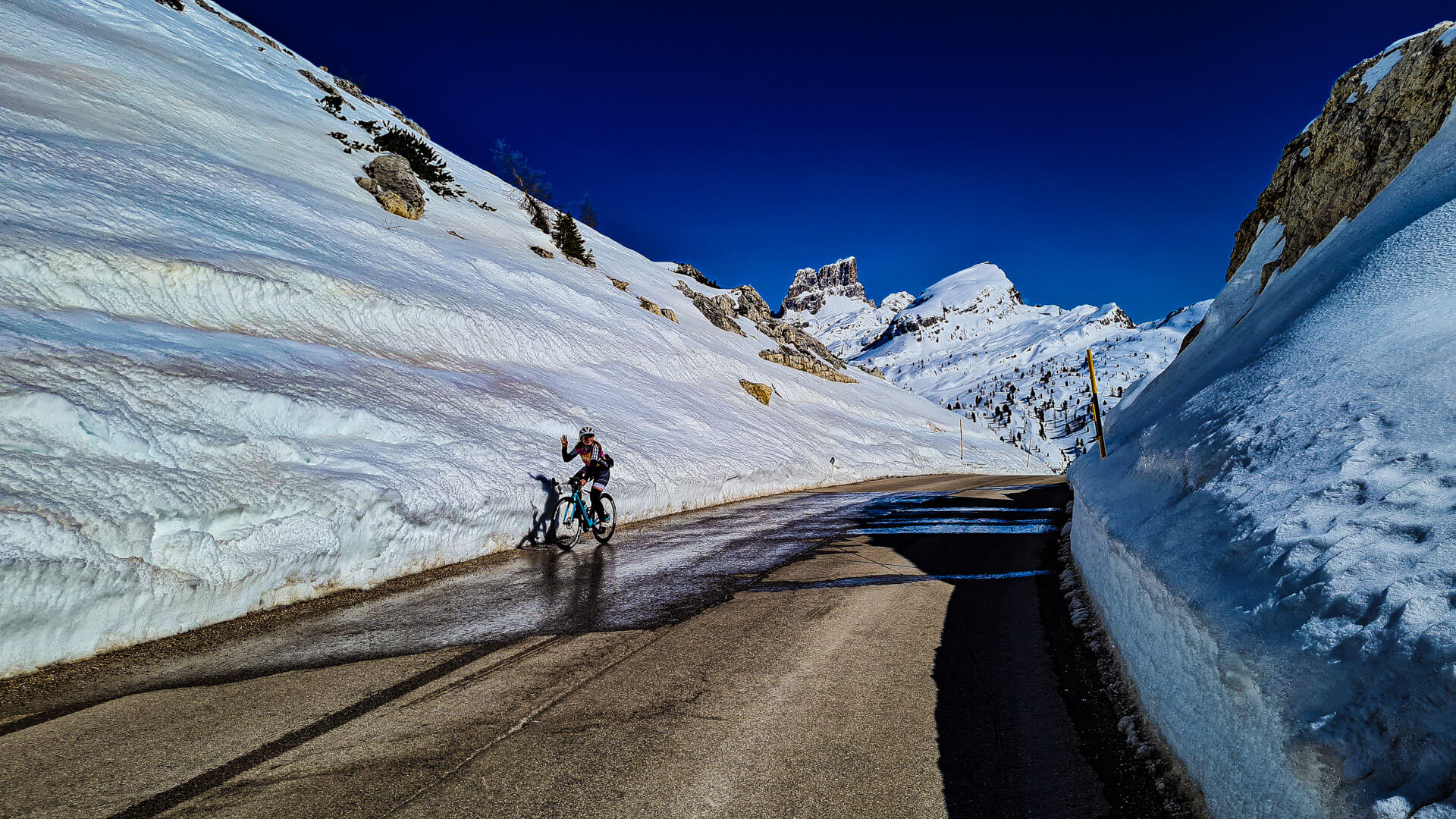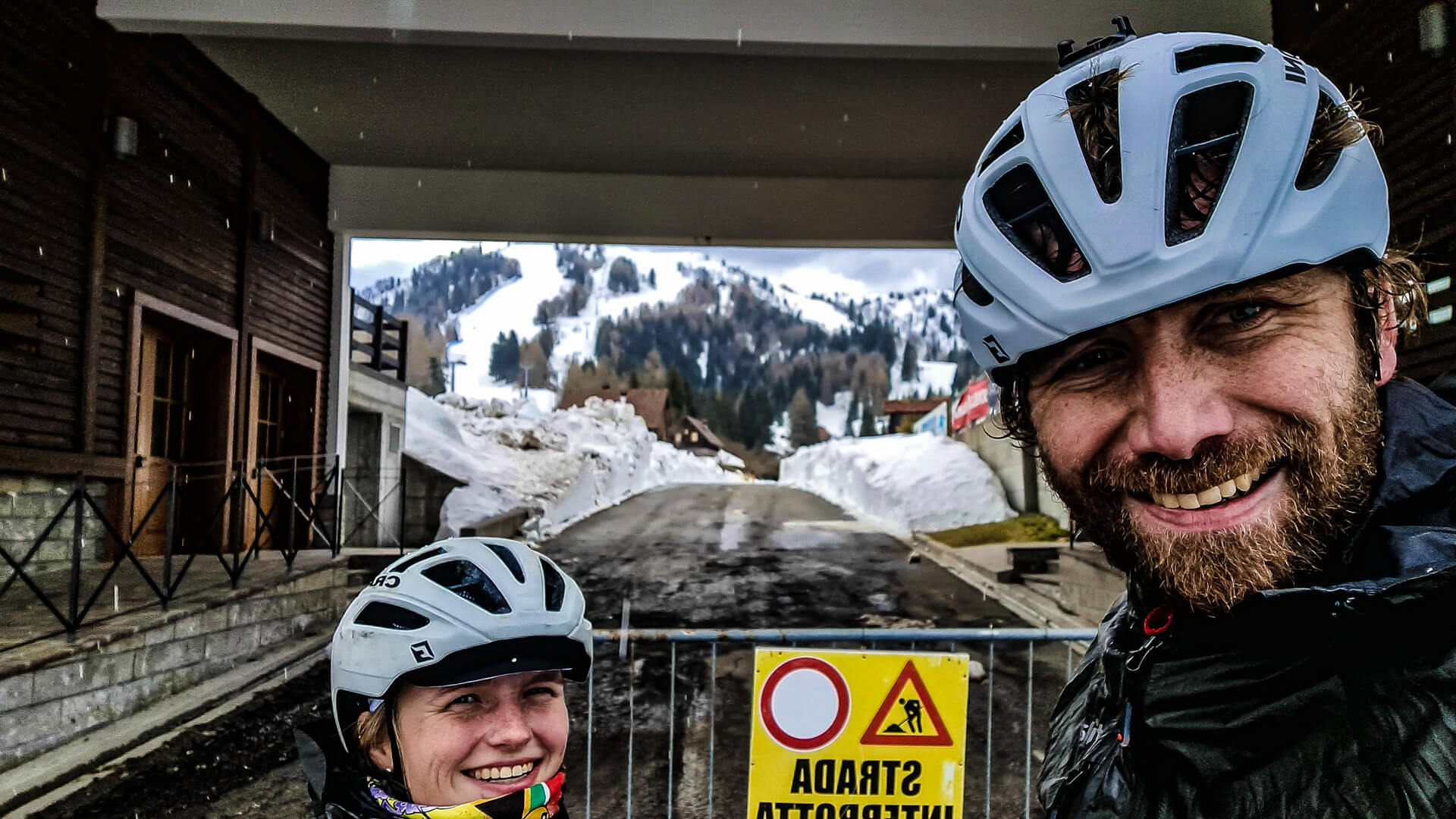 V Alpách to není takto z jara ideální kvůli množství sněhu a letos je ho navíc neobyčejně mnoho. Průběh jejich výstupu je proto vskutku dramatický. “Čekali jsme, že nám počasí bude do projektu házet vidle. To bylo jasné od samého začátku. Proto ostatně máme nějakou časovou rezervu," upozorňuje Peggy. Základní myšlenka projektu byla jeden den jet Everesting a dva dny mít pauzu na přesun, regeneraci a práci. Teď už dvakrát museli čekat o den déle, protože je počasí nahoru nepustilo. "Cesta před startem 2. Everestingu na Passo di Falzarego se během noci pokryla sněhem a ledem. Do dalšího dne to ale zase odtálo,“ líčí Pavel.