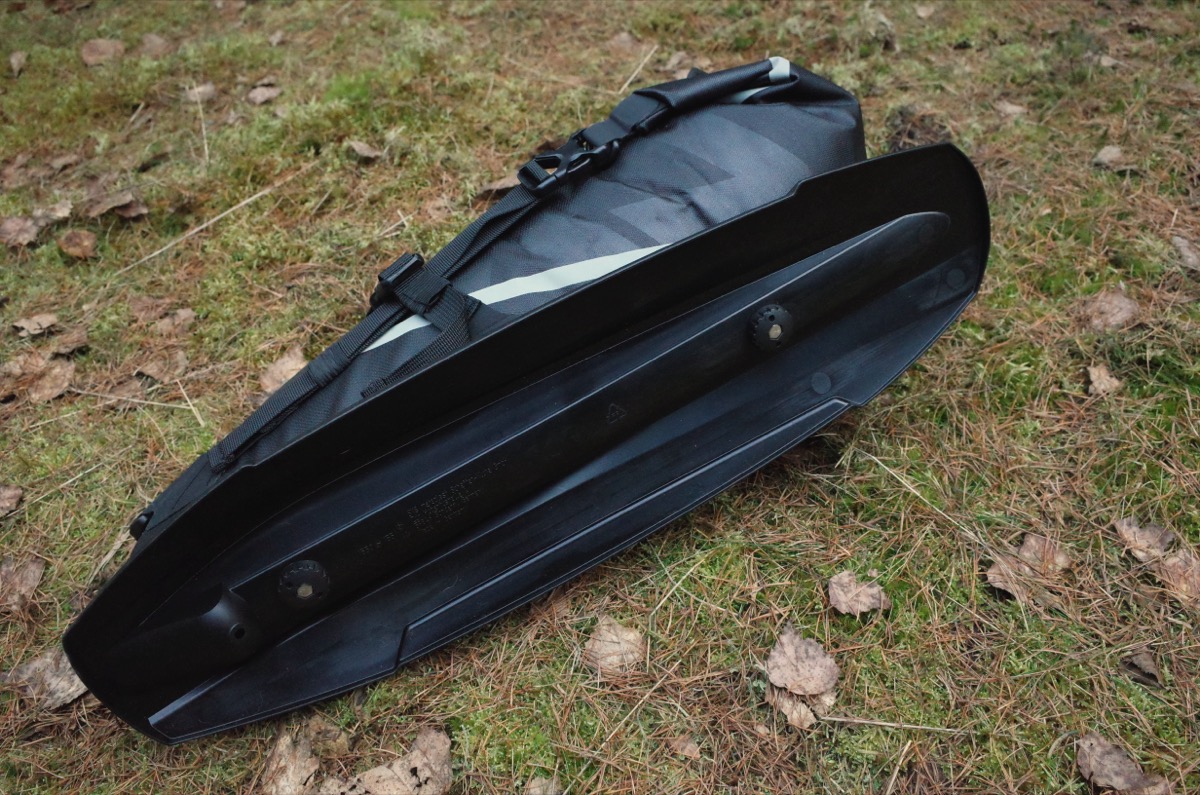 Součástí balení brašny je…Sedíte? Blatník! Regulerní, široký plastový bahnožrout Made in Germany o délce 48 cm a šířce 14 cm. Jako fakt. Ne, že by samotná brašna jako blatník nefungovala, ale vzhledem k jejímu užšímu profilu v místě sedlovky a možnosti ji snadno přenášet díky ramennímu popruhu to dává více než smysl.