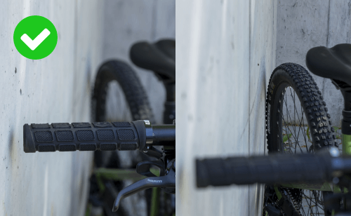 Nejlepší je opírat kolo o zadní plášť. Styčná plocha je dostatečně velká na to, aby kolo spolehlivě stálo, a gripů ani sedlu žádné šrámy nehrozí. Šetrný způsob pro kolo však umí být nešetrný ke zdi. Pláště často nechávají na omítce stopy. Tak pozor, aby vám majitel objektu nenaúčtoval čištění fasády.