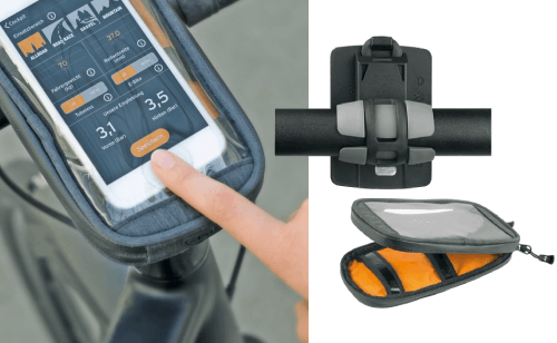 Speciální přihrádka na smartphone má přes displej průhlednou fólii, takže telefon je dobře čitelný a přístoj v pouzdře ovladatelný. Výhodou je voděodolnost a ochrana před mechanickým poškozením, nevýhodou hůře dostupná boční tlačítka. Nepraktická je i pozice pouzdra až za představcem, což při čtení mapy nutí jezdce hodně klopit zrak.