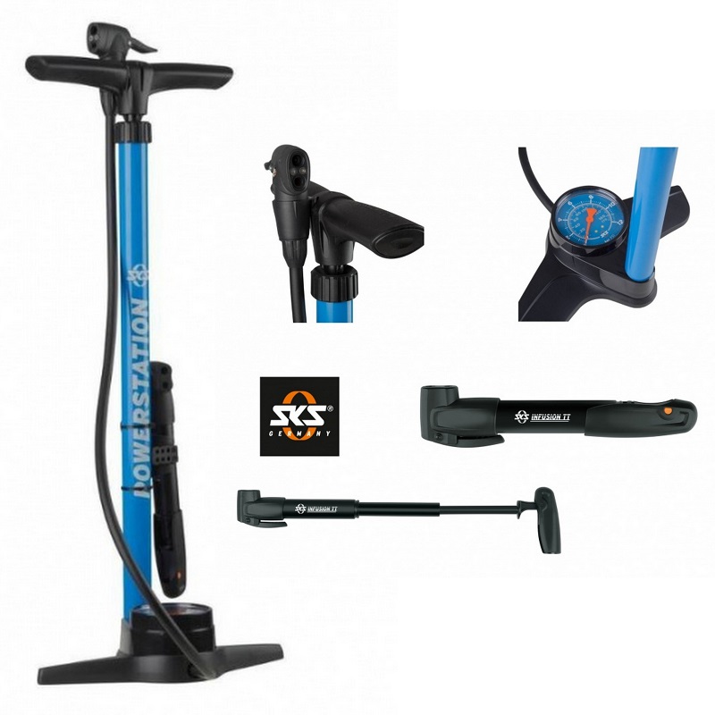 Akční balíček nožní pumpy pro domácí použití a malé hustilky najde uplatnění v každé cyklo domácnosti. SKS Powerstation je robustní servisní pumpa, která je snadno ovladatelná díky univerzální ventilkové hlavě s upínací pákou. Integrovaný 70mm manometr zaručuje přesné ovládání tlaku. Ocelové tělo pumpy a velká základna z ní dělá bytelnou servisní pumpu.