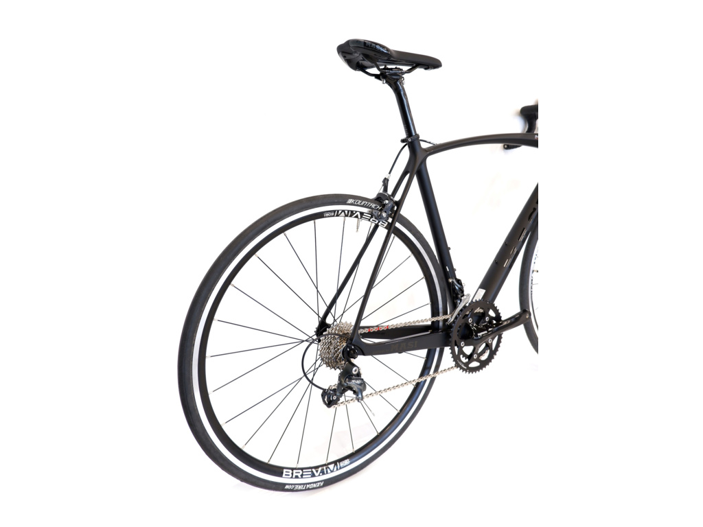 Karbonové silniční kolo pro závodní a výkonnostní použití. Spolehlivá sada Shimano Tiagra s 2x10 převody bravurně zvládne řazení i brzdění a bezdušová kola Brev.M s plášti Kenda vás budou pevně držet v silniční stopě.