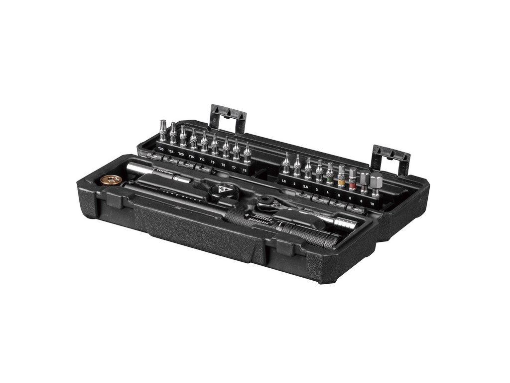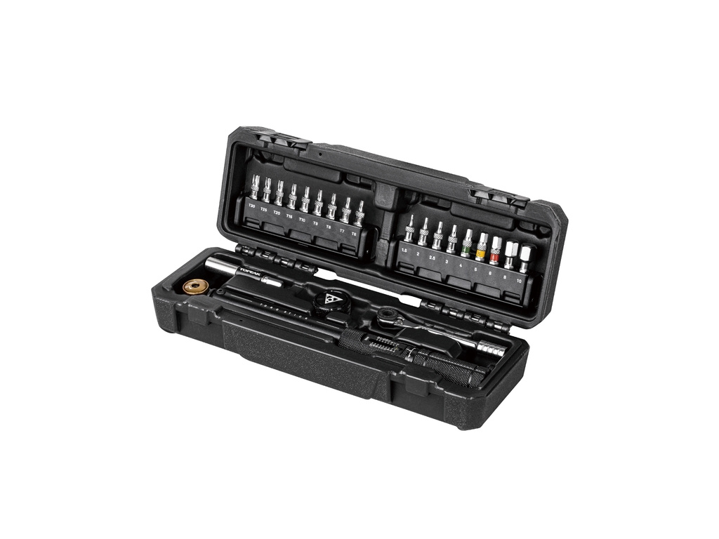 Sada profesionálního dílenského momentového klíče s nastavitelným rozsahem hodnot 4 - 20 Nm, malé pomocné ruční ráčny, miniaturního násadového klíče pro jemnou práci prsty a soupravy 18 bitů o délce až 30 mm pro lepší dosah s nářadím ve slabě přístupných místech. Přepínací ráčňová hlavice s jemným chodem a se standardním 6-hranem umožňuje zvolit na analogové vertikální stupnici rozsah hodnot utahovacích momentů pomocí spodního otáčecího přepínače a zároveň poskytuje korekci o 0.5 Nm. Magnetický prodlužovací adaptér na bity zlepšuje přístup ke šroubům na komplikovanějších místech.