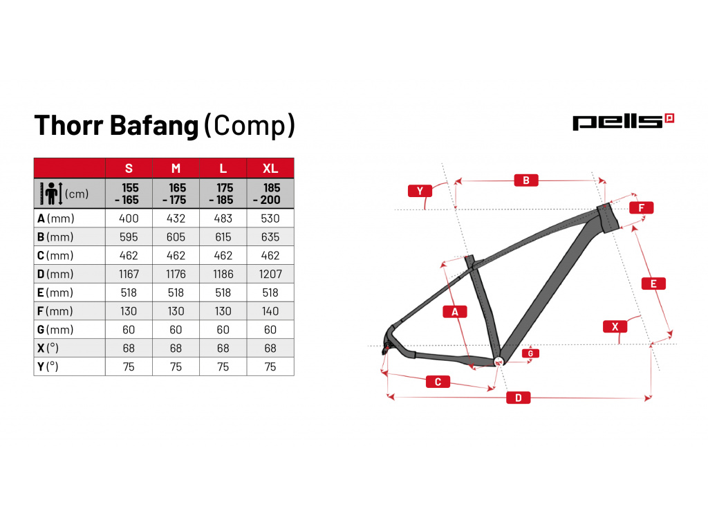 Přepracovaný model elektrokola Pells Thorr Comp nabízí zcela nový rám s plně integrovanou baterií s kapacitou 630 Wh a osvědčeným středovým motorem Bafang M500. Ten nabízí 5 úrovní přípomoci a díky torznímu senzoru přesně dávkuje dodávaný kroutící moment až 95 Nm. Nástup výkonu tak přesně odpovídá potřebám jezdce a nedochází k nežádoucímu “kopání”. Navíc lze motor přepnout do režimu chůze, který oceníte například při tlačení kola do prudkého kamenitého kopce. Vnitřní vedení bowdenů nechá naplno vyniknout čistý a jednoduchý design celého rámu. Pro zajištění co nejlepších jízdních vlastností a spolehlivého přenosu výkonu bez ohledu na povrch jsme zvolili kvalitní pláště Continental Ruban. Výbavu modelu Thorr Comp dále doplňuje pohon Shimano Deore 1x12, hydraulické brzdy Shimano BR-MT201 a vzduchová vidlice SR Suntour XCR 100 mm.