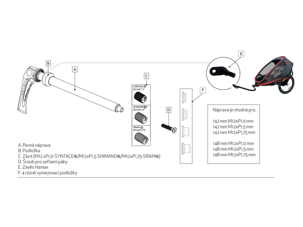 Pevna osa HAMAX, která umožňuje připevnit přívěs za kolo k téměř jakémukoli kolu.