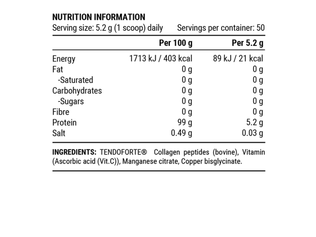 - TENDOFORTE®, bioaktivní kolagenové peptidy® od německé společnosti GELITA, jsou speciálně vyvinuty pro podporu zdraví a funkce vazů a šlach. Předklinické a klinické studie prokazují, že pravidelné užívání TENDOFORTE®, zejména v kombinaci s fyzickou aktivitou, může přispět k lepší regeneraci šlach a snížení rizika přetížení. TENDOFORTE® je také klinicky testován na výrazné posílení šlach a vazů.