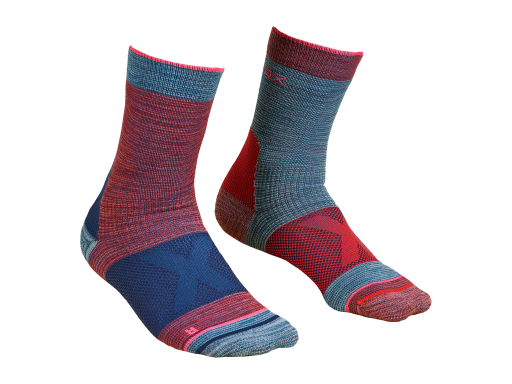 ORTOVOX Alpinist Mid jsou dámské ponožky a ideální společník na všechny horské, lezecké a alpinistické túry. Jsou pleteny ze směsi Merino vlny a syntetiky, díky čemuž jsou velmi odolné, příjemné a funkční. Vlna výborně absorbuje vlhkost do svého jádra a hřeje i za mokra. Navíc má antibakteriální schopnosti a neutralizuje pachy. Polyamidová vlákna zvyšují odolnost i životnost ponožek. Během procesu bezešvého pletení jsou vytvářeny speciální zóny, z nichž každá plní svůj specifický účel: Špičky mají ploché švy pro eliminaci puchýřů, vyztužená pata a špička podporuje komfort a delší životnost a 360° pás kolem klenby chodidla zajišťuje prodyšnost a odvádí vlhkost.