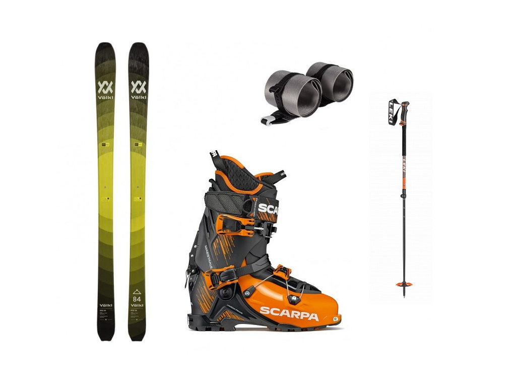 Skialpové lyže VÖLKL Rise Up 84 v délce 178 cm, vázání MARKER Aplinist Demo 8, boty SCARPA Maestrale 4.0 (velikost dle výběru na prodejně), hole LEKI Helicon Lite.