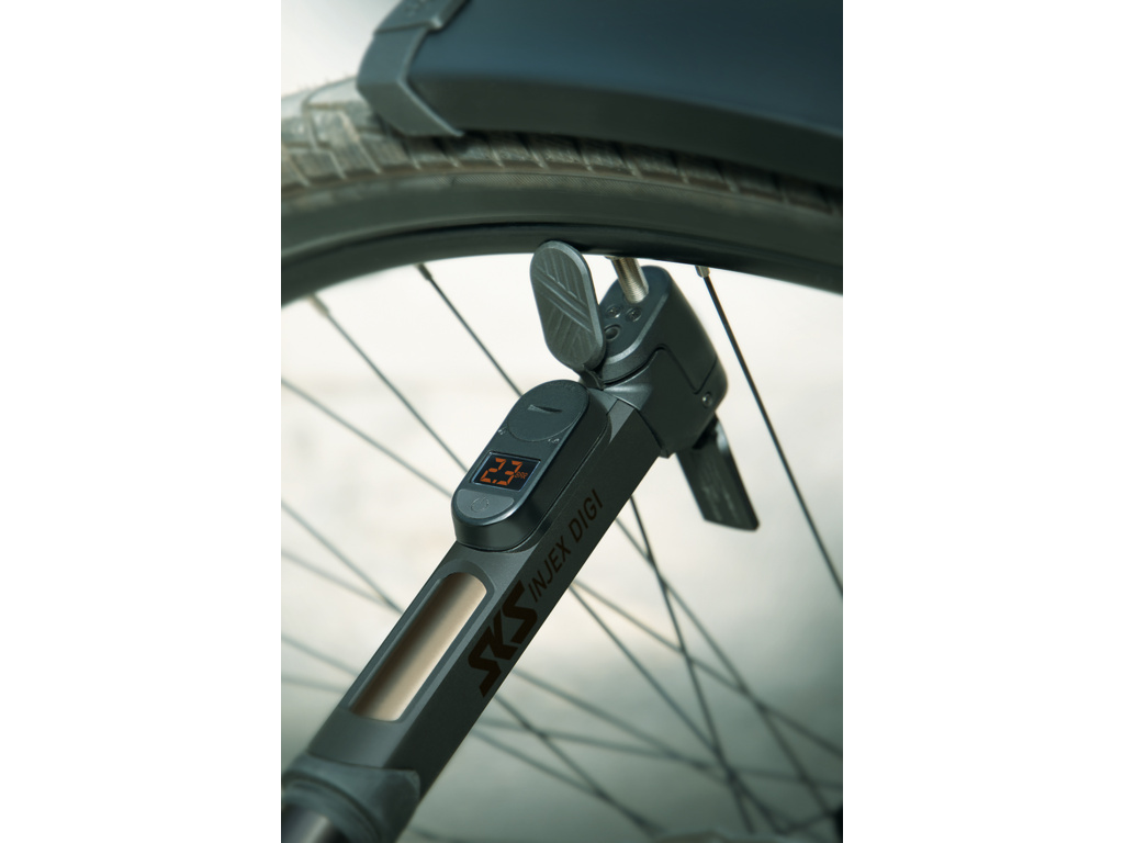 INJEX CONTROL DIGI je vybavena digitálním, snadno čitelným tlakoměrem, který umožňuje přesné měření tlaku na cestách. Má také texturovanou dvoukomponentní rukojeť a ergonomicky potaženou kompresní trubici. Rukojeť ve tvaru T je ohnuta pod úhlem 60 stupňů, takže předloktí a pumpa tvoří během procesu pumpování přímku. To zajišťuje ergonomickou a pohodlnou manipulaci i při delším tlakování. Hlava pumpy s 5-ti stupňovým sklonem také výrazně usnadňuje huštění pláťů.