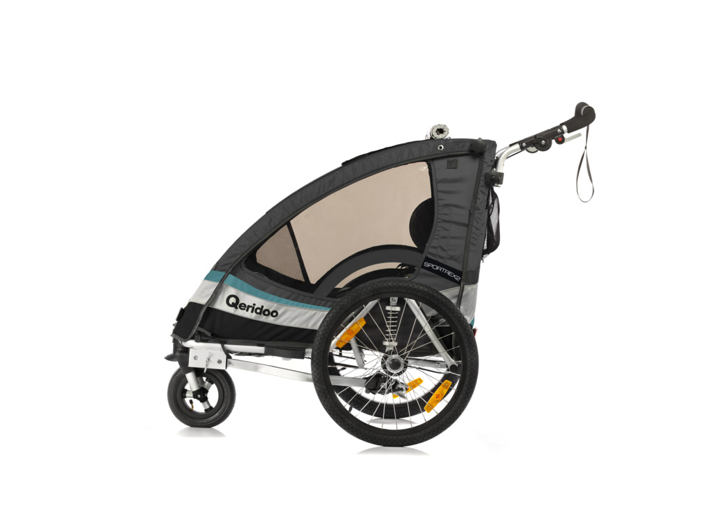 Qeridoo Sportrex2 je dvoumístný, odpružený, multifunkční vozík za kolo. Lze jej použít i jako kočárek do města nebo po zaaretování kočárkového kolečka i jako kočárek do terénu, nebo na běhání.