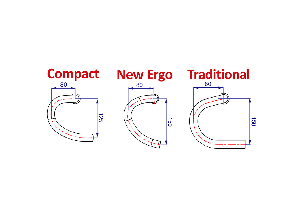 Silniční duralová řidítka vyrobená z materiálu AL7050 Double Butted a využívající oblouk New Ergo, který je 80mm dlouhý a 150mm hluboký.